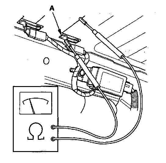 8. Check for continuity by touching one tester probe to the window antenna terminal (A), and move the other tester probe along the antenna wires.