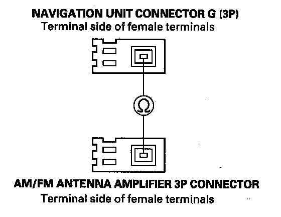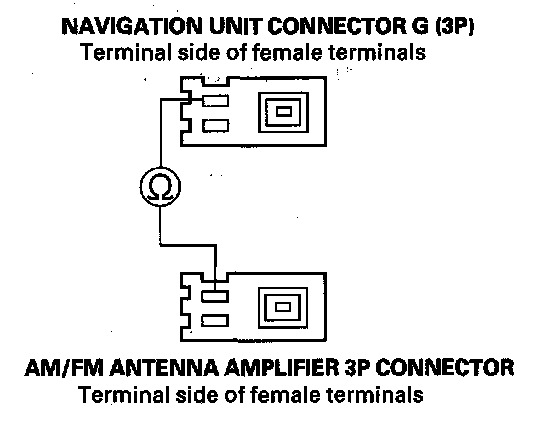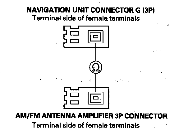 23. Check for continuity between navigation unit connector G (3P) No. 1 terminal and the AM/FM antenna amplifier 3P connector No. 1 terminal.