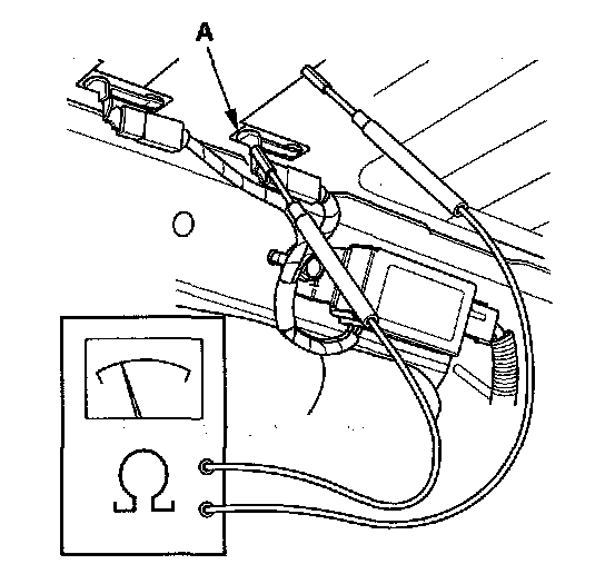 8. Check for continuity by touching one tester probe to the window antenna terminal (A), and move the other tester probe along the antenna wires.
