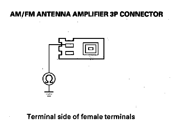 16. Check for continuity between the AM/FM antenna amplifier connector (3P) No. 3 terminal and body ground.