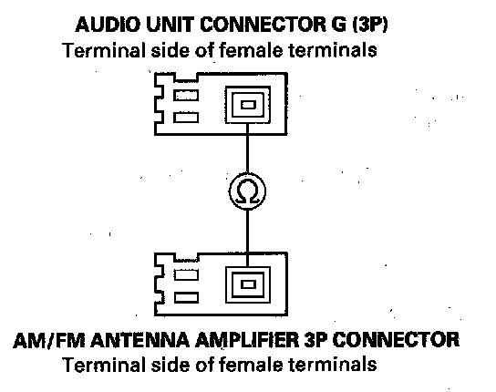 17. Check for continuity between audio unit connector G (3P) No. 3 terminal and the AM/FM antenna amplifier 3P connector No. 3 terminal.