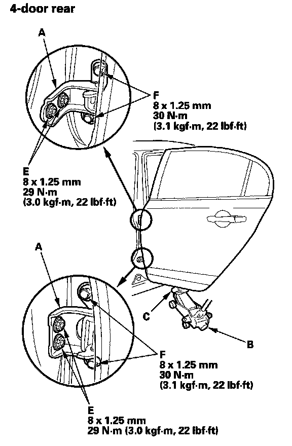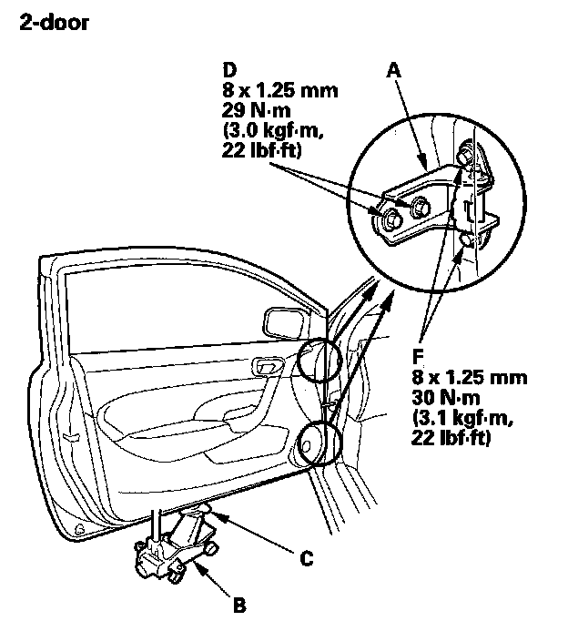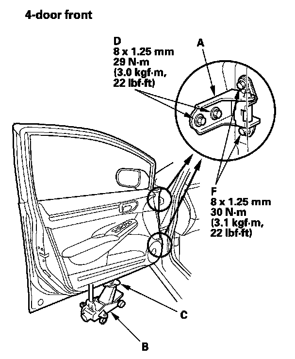 3. If necessary, replace the door mounting bolts with the adjusting bolts (P/N 90102-SFA3.05) made specifically for door adjustment, then adjust at the door: Loosen the door mounting bolts (F) slightly, and move the door up or down as necessary to equalize the gaps, and move it in or out until it's flush with the body.
