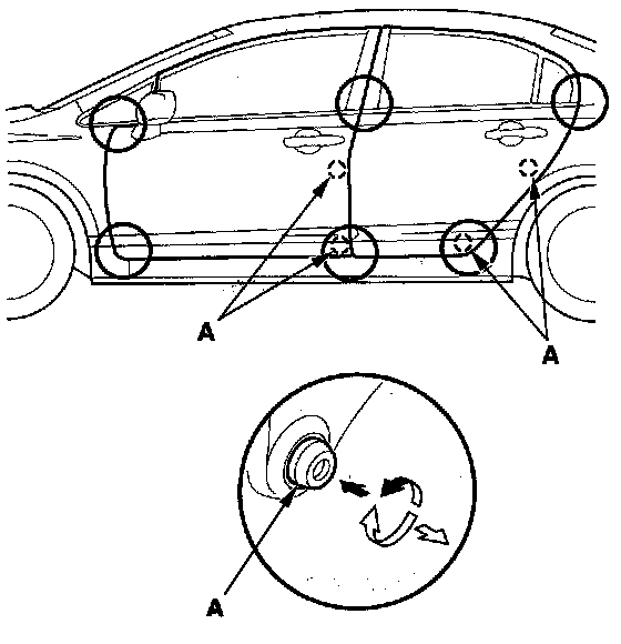 4. Check that the door and body edges are parallel. If necessary, adjust the door cushions (A) to make the rear of the doors flush with the body.