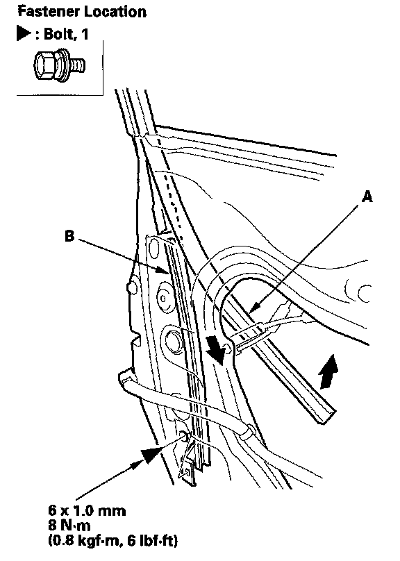 7. Pull the glass run channel (A) away as needed, and remove the bolt, then remove the center lower channel (B) by pulling it downward.