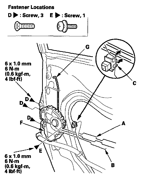 8. Detach the latch cable (A) and inner handle cable (B) from the holder (C), then remove the screws (D, E) securing the latch (F), then remove the latch through the hole in the door. Take care not to bend the outer handle rod (G), latch cable, and inner handle cable.