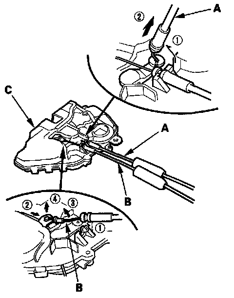 10. Detach the latch cable (A) and the inner handle cable (B) from the latch (C).