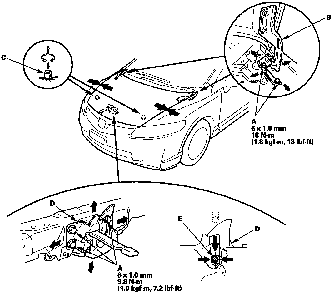 4. Adjust the hood latch (D) to obtain the proper position at the forward edge, and move the hood latch right or left until the striker (E) is centered in the hood latch.