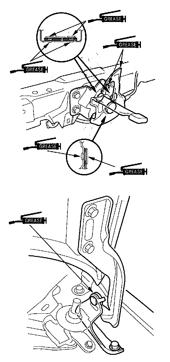 8. Apply multipurpose grease to the hood latch and hood hinges as indicated by the arrows.