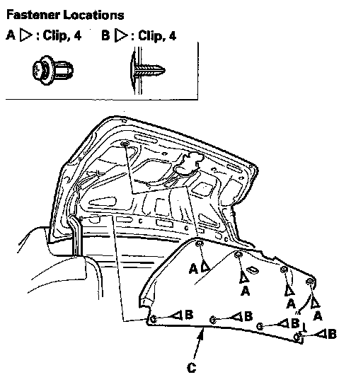 2. Remove the clips (A, B), then remove the trunk lid trim (C).