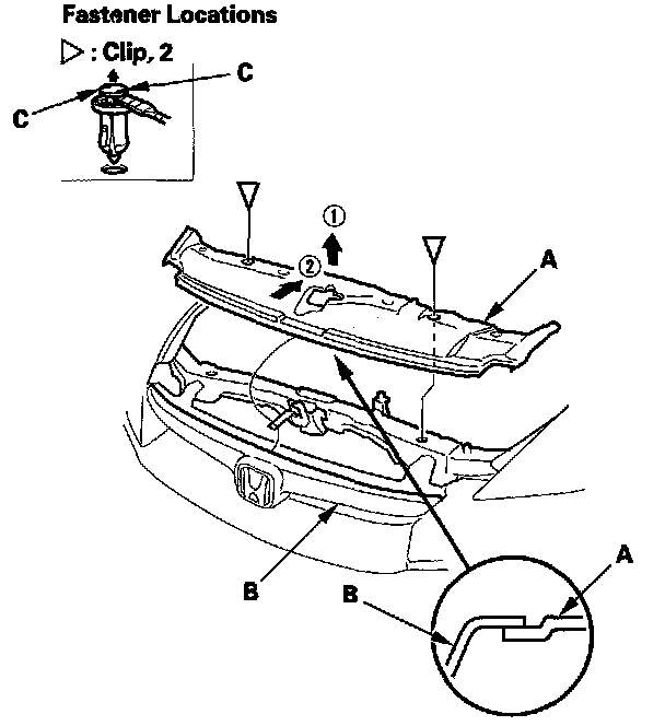 2. Remove the clips by carefully pulling the front grille cover (A) up, then remove the cover by releasing the front edge of the cover from the grille (B). Take care not to scratch the body.