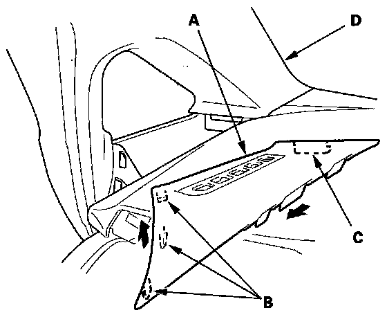 2. Pull the trim away to release the front hook (C) from the A-pillar trim (D).