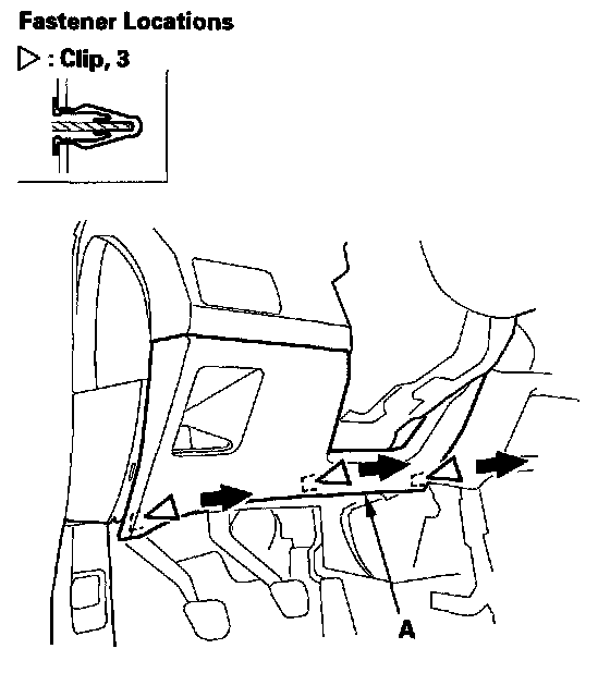 2. Gently pull out on the lower edge of the dashboard lower cover (A) to detach the lower clips.