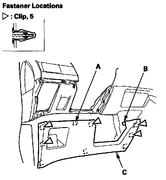 3. Detach the upper clips, and release the hook (A) and pin (B) by pulling the driver's dashboard lower cover (C) back.