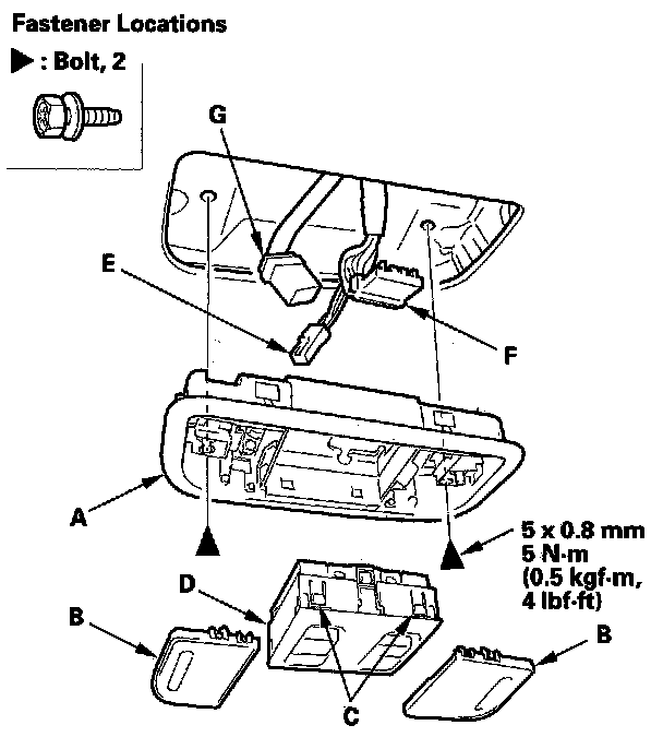 4. Disconnect the front individual map light connector (E). If equipped, disconnect the moonroof switch connector (F) and the navigation microphone connector (G).