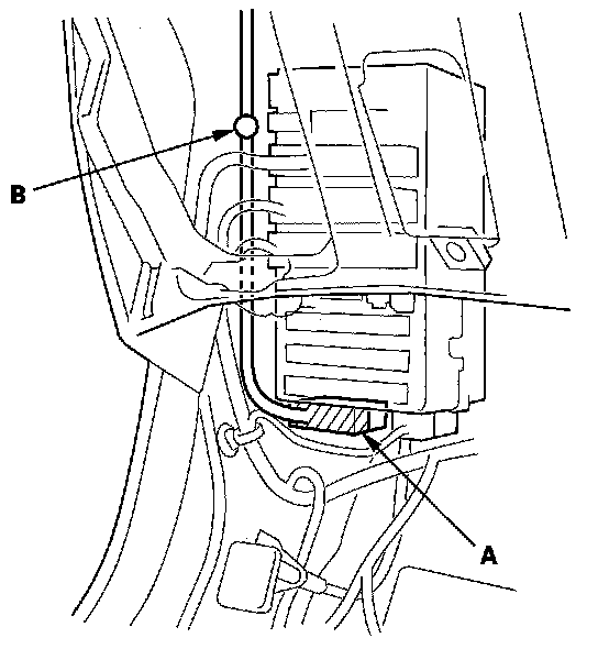 11. Without moonroof: From under the dash, disconnect the roof wire harness connector (A), and detach the harness clip (B).