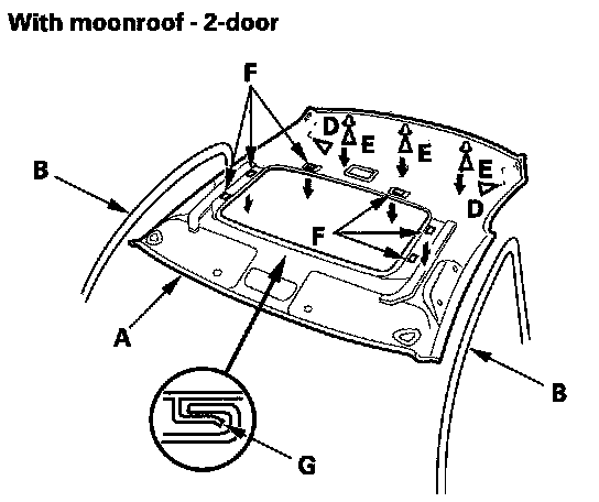 5. With moonroof: Release the hooks (G) of the moonroof by moving the headliner rearward.