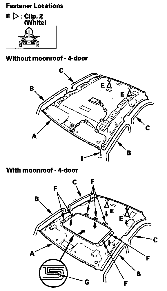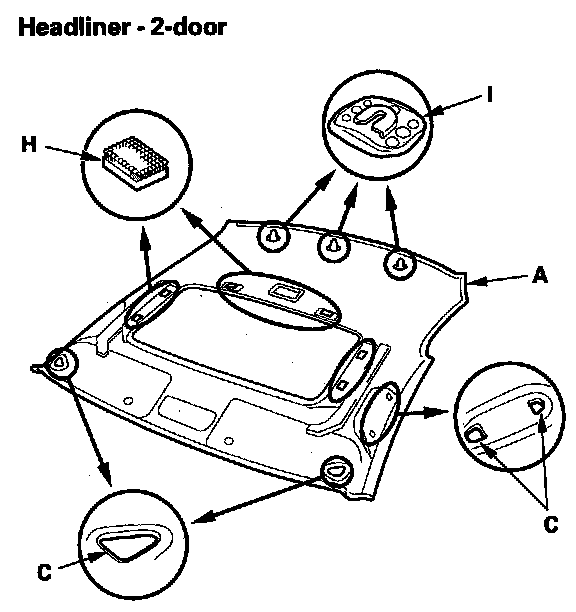 - Any Velcro fasteners (H) and clip bases (I) which have come off the headliner