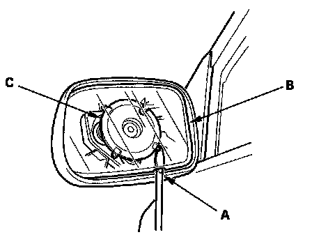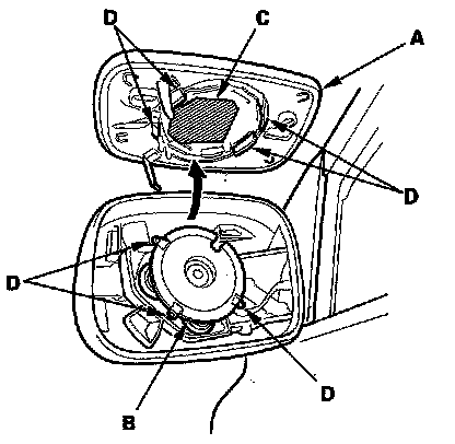 5. Separate the mirror holder (A) from the actuator (B) by slowly pulling the mirror apart while separating the adhesive (C), and release the hooks (D). If equipped, disconnect the mirror defogger connectors from the heater pad terminals.
