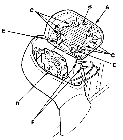 4. Separate the mirror holder from the actuator (D) by releasing the hooks (E). If equipped, disconnect the mirror defogger connectors (F).