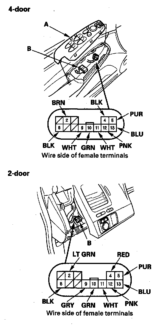 2. Disconnect the 13P connector (B) from the power mirror switch.