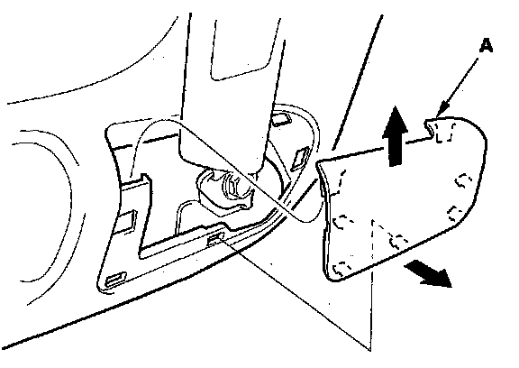 5. Except 2-door passenger's seat: Slide the front seat forward fully, carefully pry up on the bottom edge of the anchor cover (A) to release the hooks, and remove the cover.