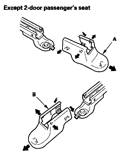 7. Remove the seat track outer end covers (A) and seat track center end covers (B) from the back of both seat tracks.