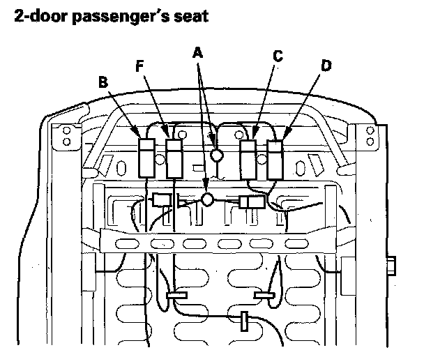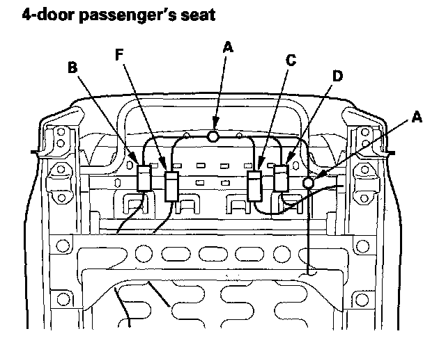 10. Lift up the front seat, then detach the harness clips (A), and disconnect the side airbag connector (B), the seat belt switch connector (C), the seat belt buckle tensioner connector (D), and the seat position sensor connector (E) on the driver's seat. On passenger's seat, disconnect the ODS subharness connector (F).