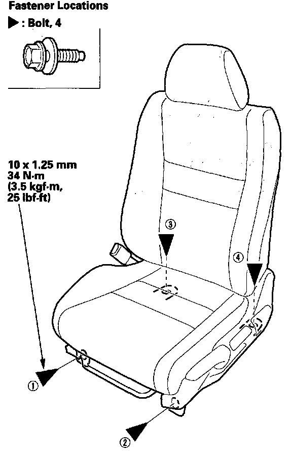 - Tighten the seat mounting bolts to the specified torque in the sequence shown. Slide the seat all the way back and tighten (1) and (2), then slide it forward and tighten (3) and (4). The driver's seat is shown; the passenger's seat is similar.
