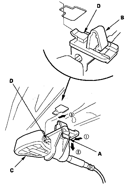 5. Push the tab (A) to release the hook (B), and rotate the seat-back release lever (C) clockwise to release the hook (D).