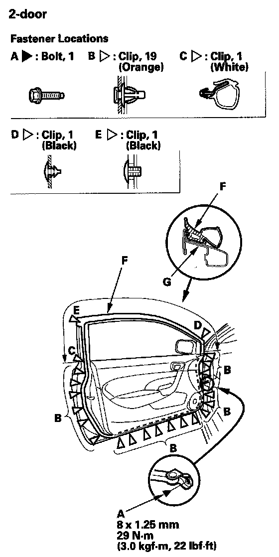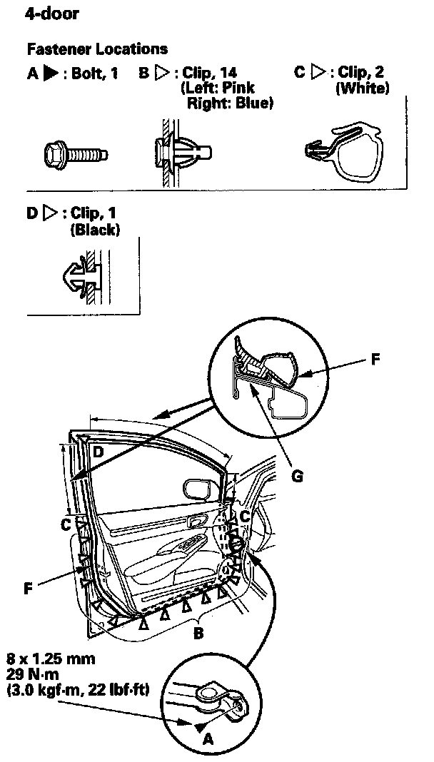 2. Detach the clips (B, C, D, E), then remove the door weatherstrip (F).