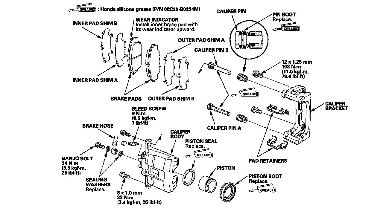 Front Brake Caliper OverhaulCAUTION: Frequent inhalation of brake pad dust, regardless of material composition, could be hazardous to your health.