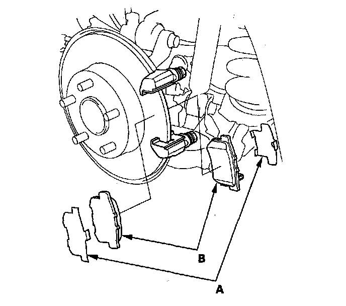 3. Check the thickness (A) of the inner pad (B) and outer pad (C). Do not include the thickness of the backing plate.