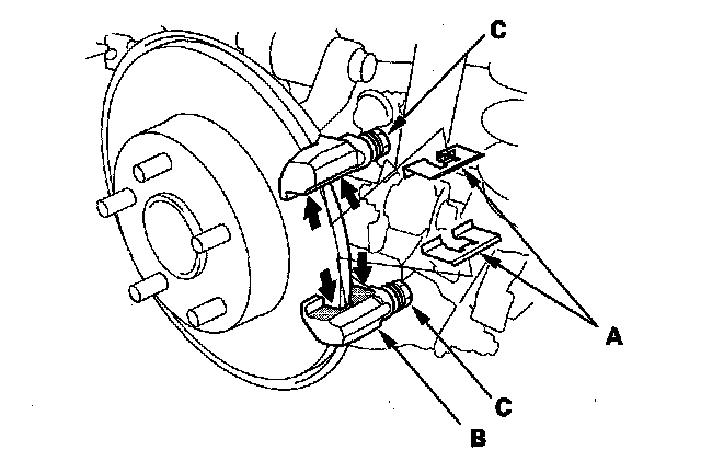 8. Clean the caliper bracket (B) thoroughly; remove any rust, and check for grooves and cracks. Verify that the caliper pins (C) move in and out smoothly. Clean and lube if needed.
