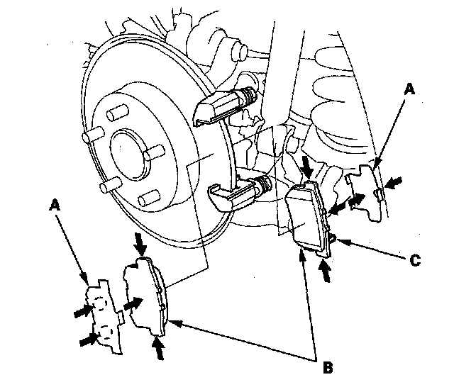 13. Install the brake pads and pad shims correctly. Install the brake pad with the wear indicator (C) on the bottom inside. If you are reusing the brake pads, always reinstall the brake pads in their original positions to prevent a momentary loss of braking efficiency.