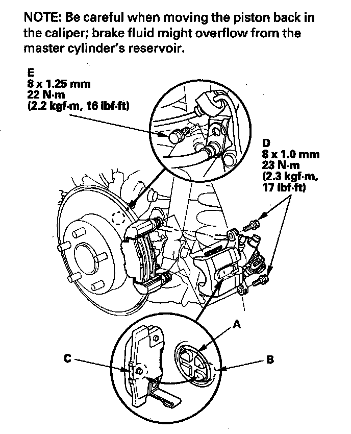 NOTE: Be careful when moving the piston back in the caliper; brake fluid might overflow from the master cylinder's reservoir.