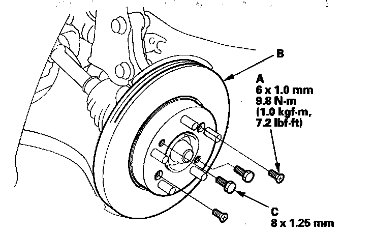 NOTE: If the brake disc is stuck to the front hub, thread two 8 x 1.25 mm bolts (C) into the brake disc to push it away from the front hub. Turn each bolt 90 degrees at a time to prevent the brake disc from binding.
