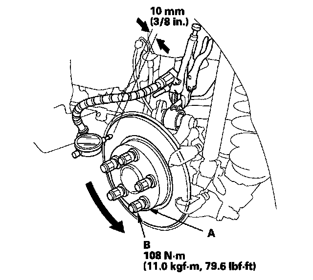 6. Set up the dial gauge against the brake disc as shown, and measure the runout at 10 mm (3/8 in.) from the outer edge of the brake disc.