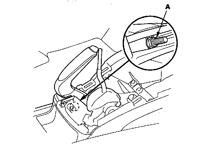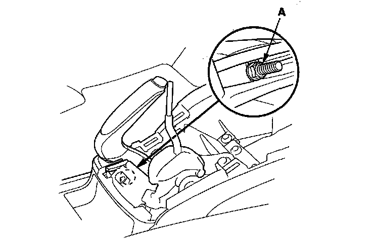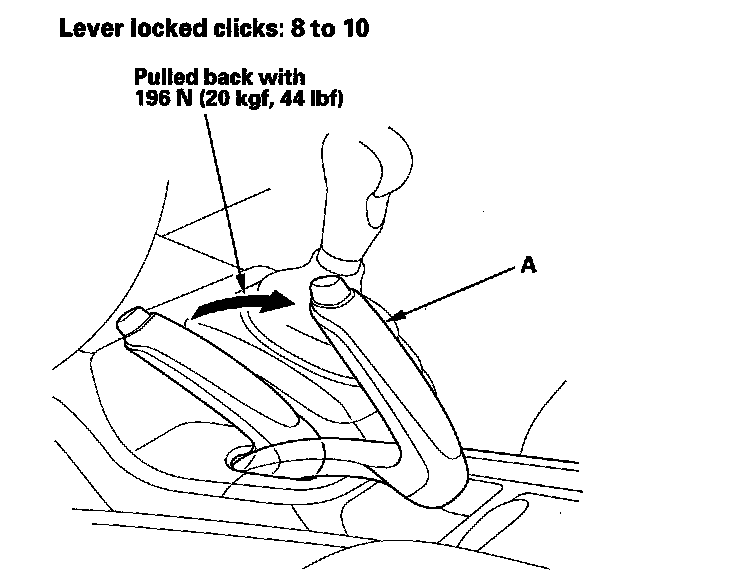 1. Pull the parking brake lever (A) with 196 N (20 kgf, 44 lbf) of force to fully apply the parking brake. The parking brake lever should be locked within the specified number of clicks.