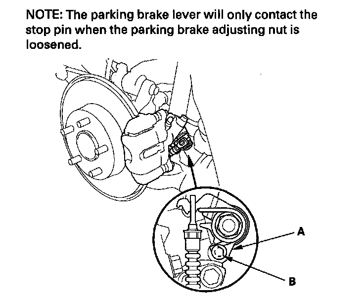 6. Make sure the parking brake lever (A) on the rear brake caliper contacts the stop pin (B).