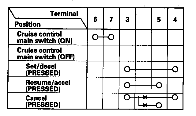 - If there is continuity,and it matches the table, but switch failure occurred on the cruise control input test, check and repair the wire harness on the switch circuit.