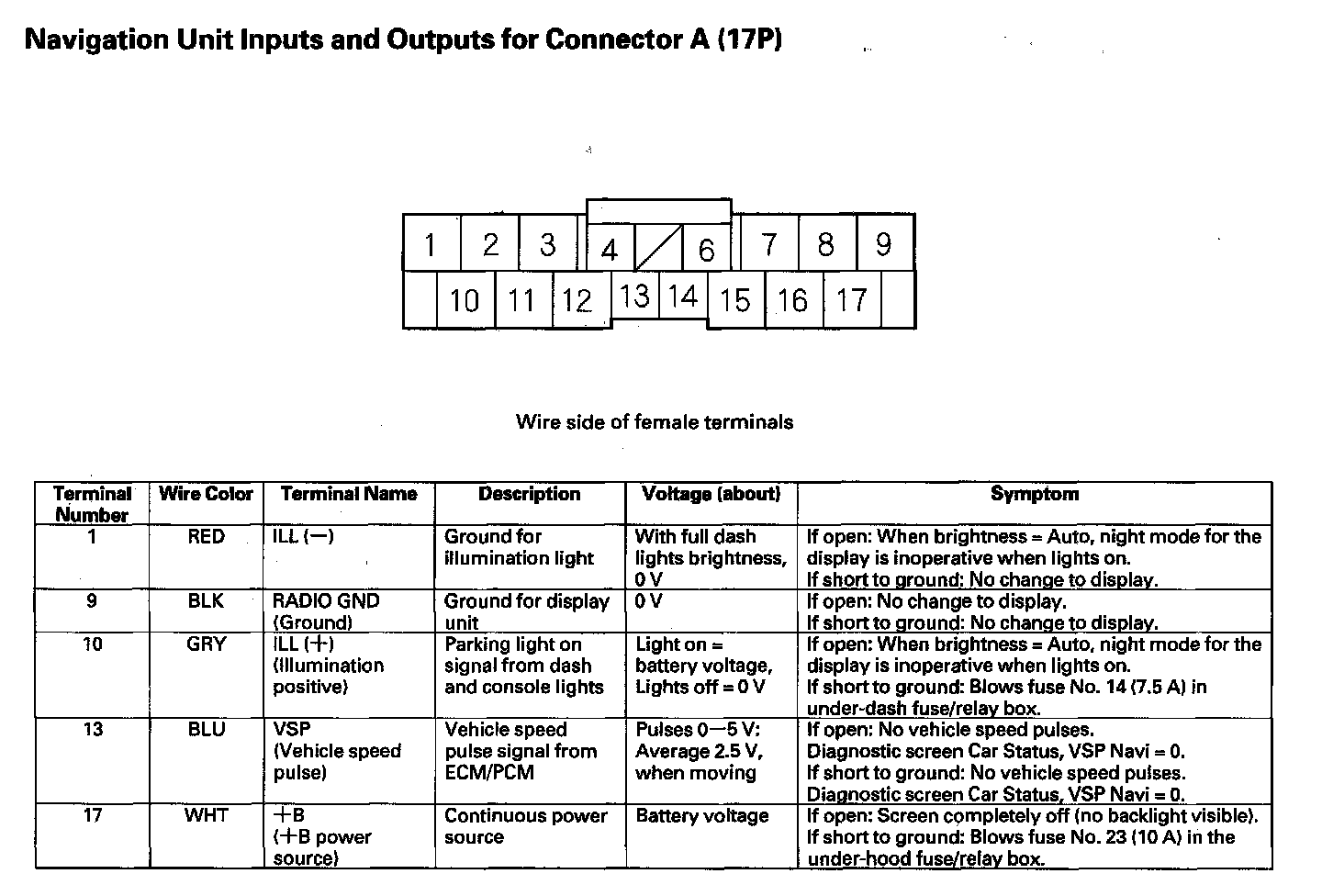 Navigation Unit Inputs And Outputs For Connector A (17P):