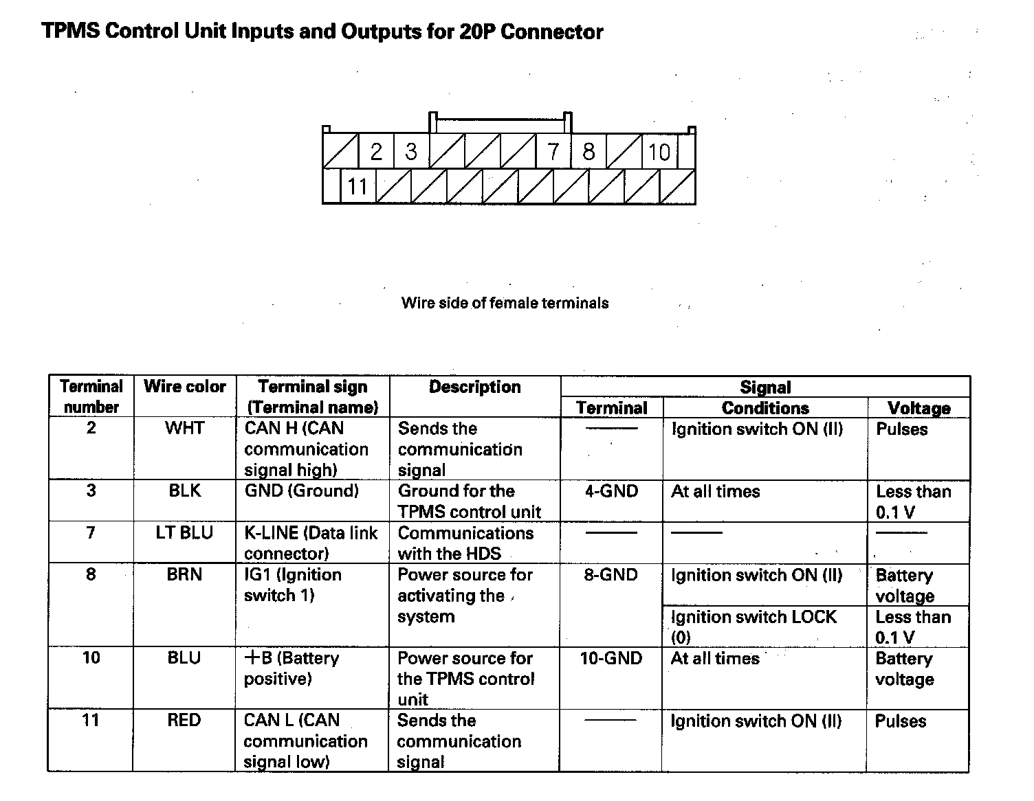 TPMS Control Unit Inputs and Outputs for 20P Connector: