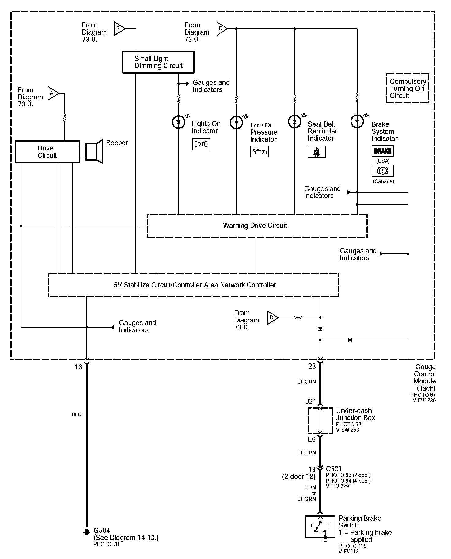 Diagram Set 73 (Reminder Systems, Key Light Timer and Low Oil Pressure Indicator)