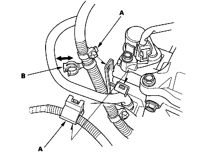 7. Remove the harness clamps (A), and disconnect the positive crankcase ventilation (PCV) hose from the clamp (B).