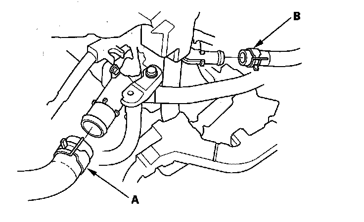 9. M/T model: Disconnect the upper radiator hose (A) and heater hose (B).