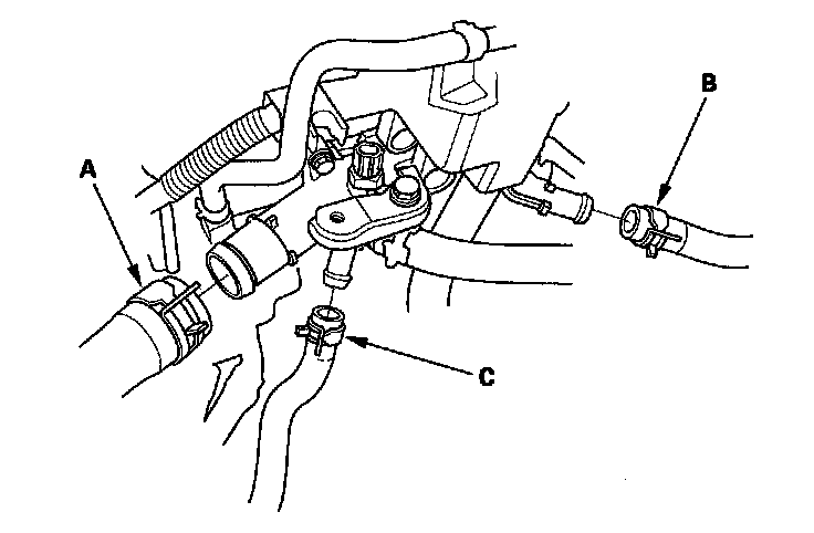 10. A/T model: Disconnect the upper radiator hose (A), heater hose (B), and water bypass hose (C).