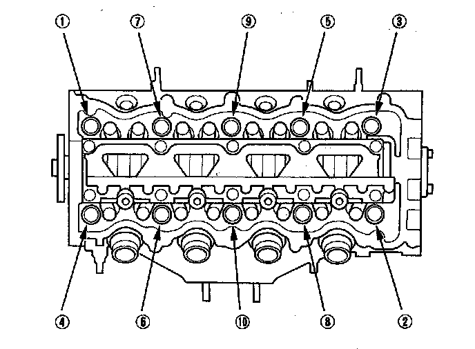 16. Remove the cylinder head bolts. To prevent warpage, loosen the bolts, in sequence, 1/3 of a turn at a time; repeat the sequence until all bolts are loosened.