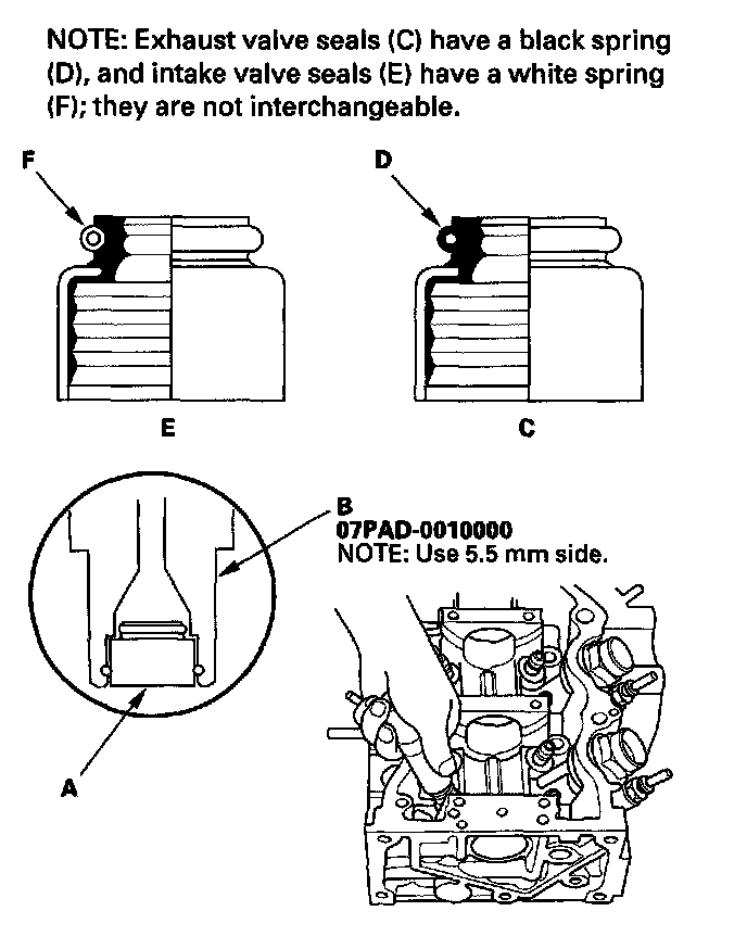 4. Install the new valve seals (A) using the stem seal driver (B).