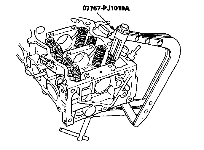 6. Install the valve spring compressor attachment and valve spring compressor. Compress the spring, and install the valve cotters.