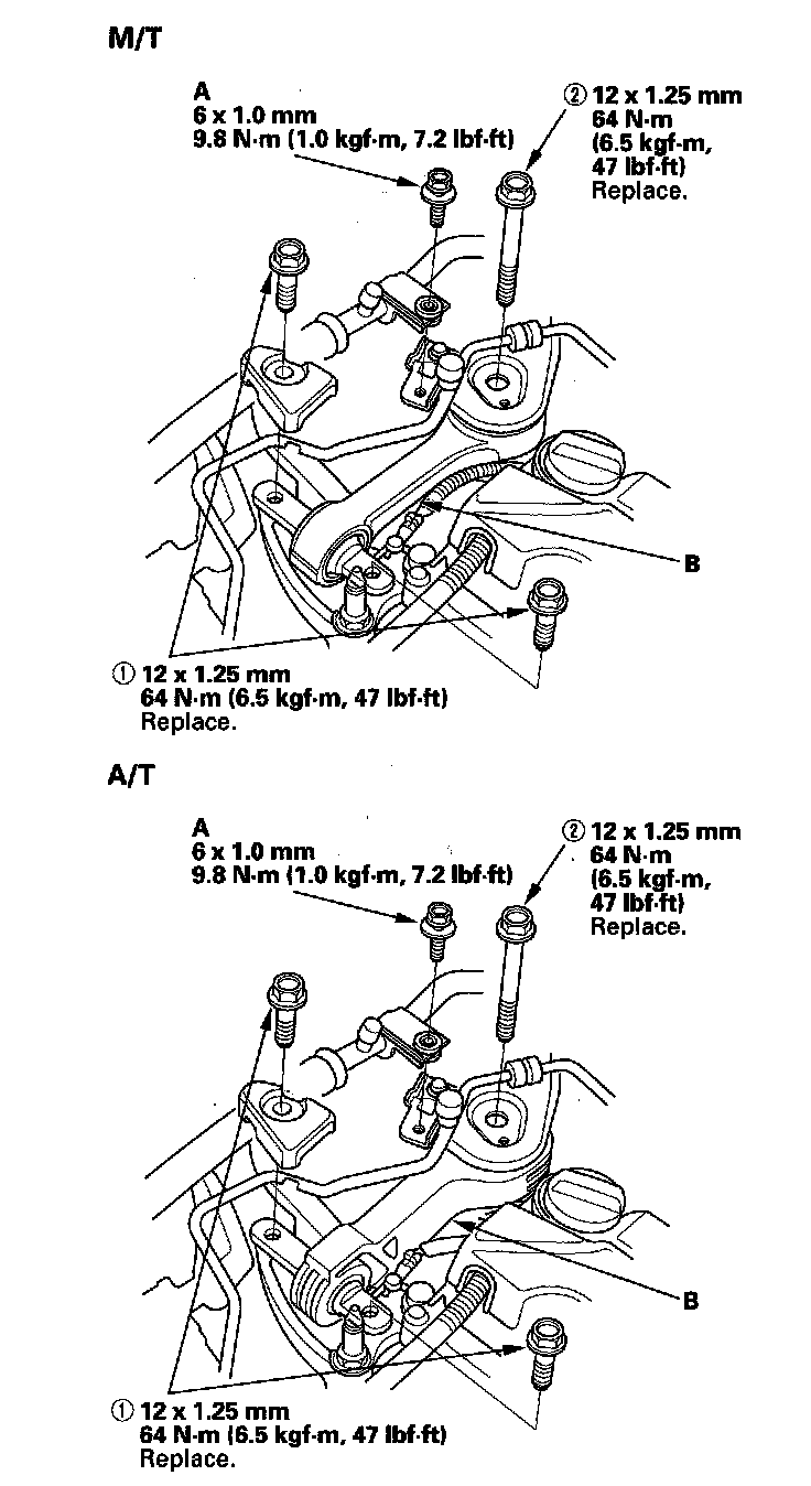 1. Remove the bolt (A) securing the A/C line, then remove the upper torque rod (B).